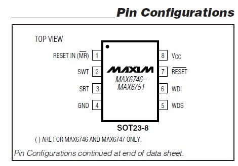 MAX6749KA+T features: (1)Factory-Set Reset Threshold Options from 1.575V to 5V in ~100mV Increments; (2)Adjustable Reset Threshold Options; (3)Single/Dual Voltage Monitoring; (4)Capacitor-Adjustable Reset Timeout; (5)Capacitor-Adjustable Watchdog Timeout; (6)Min/Max (Windowed) Watchdog Option; (7)Manual Reset Input Option; (8)Guaranteed RESET Valid for VCC ≥ 1V; (9)3.7μA Supply Current; (10)Push-Pull or Open-Drain RESET Output Options; (11)Power-Supply Transient Immunity; (12)Small 8-Pin SOT23 Packages.