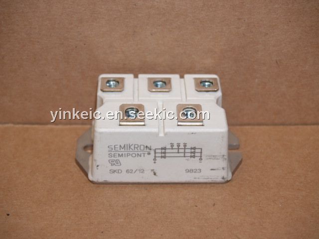 SKD62 12 features: (1)Robust plastic case with screw terminals; (2)Large, isolated base plate; (3)Blocking voltage up to 1800V; (4)High surge currents; (5)Three phase bridge rectifier; (6)Easy chassis mounting; (7)UL recognized, file no. E63 532.